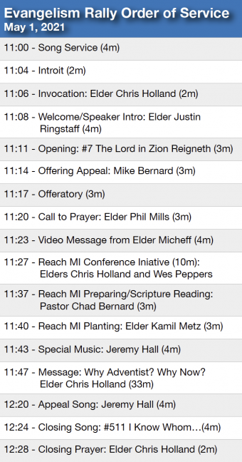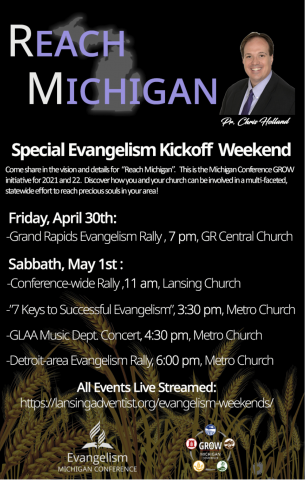 The Reach Michigan Rally will begin Sabbath (May 1) at 11:00 AM and conclude around 12:30 PM. Pastor Chris Holland will share an inspirational message and discuss the various outreach events for the Reach Michigan initiative that includes the Conference-wide evangelistic series beginning in April, 2022. There will also be a Q&A session for members to text their questions.