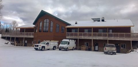 The porch on the back side of the lodge has been built, Facia and soffit installed, ice and water shield installed, shingles will be installed as weather permits